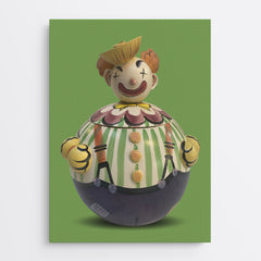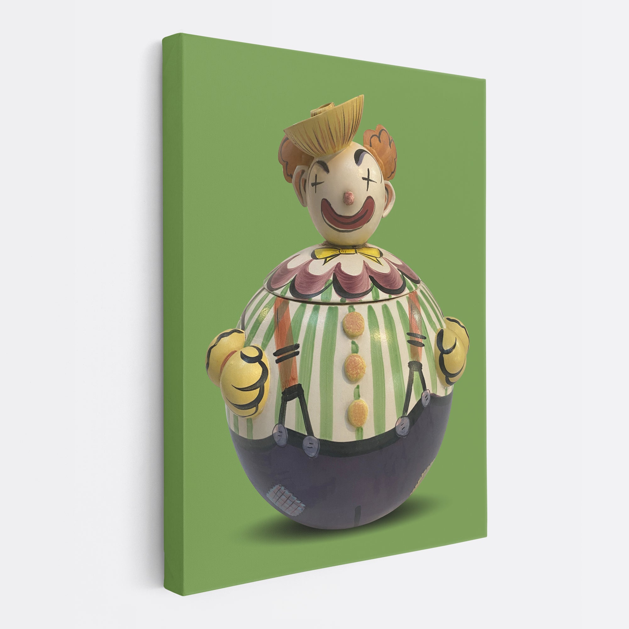 Clowns aren’t for everyone. However, for those who enjoy them, Bounce is a classic. He is a round ball with a round head and the traditional “X” eyes. I’ve never seen another cookie jar like Bounce, so I believe he’s a home-made jar. He has enough personality to be displayed alone, in a bedroom or playroom, or his canvas print can hang with some of the other “fools.”