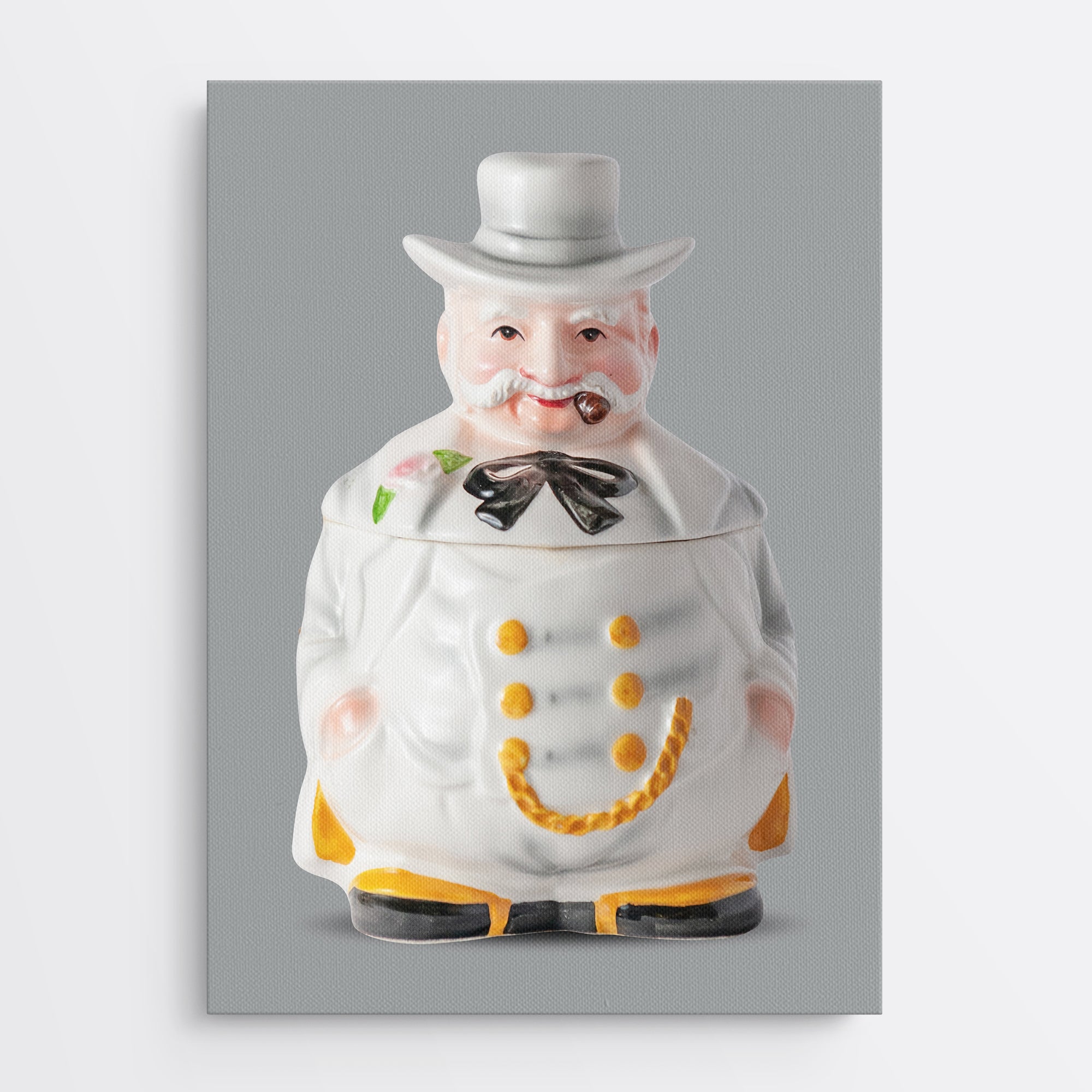 Burl is a rare cookie jar as I’ve never seen another like him. He looks like what I imagine a fancy Southern dude would look like, from the 1800s. I think families who have ancestors resembling Burl may enjoy hanging his canvas print in their homes.
